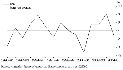 The Western Australian economy grew strongly in the three years to 2003-04, with Gross State Product (chain volume measures) increasing by 5.6% in 2001-02 and 2002-03 and by 8.1% in 2003-04, much higher than the long run average of 4.1%. However, in the most recent year (2004-05) growth fell below the long run average to 2.7%, suggesting that shortages of skilled labour may have had some impact on constraining growth in the economy.