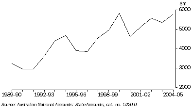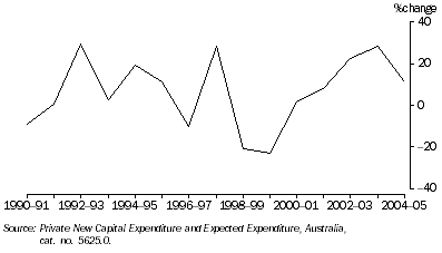 However, growth in business investment slowed considerably in 2004-05, declining to 11.5% ($1,017 million) from 28.2% ($1,952 million) in 2003-04. This was mainly the result of capital investment plans in the resources sector being brought forward in 2003-04 to help satisfy the surge in demand for raw materials from China, and the completion of the 4th LNG train on the North West Shelf in 2004-05. The deceleration in investment growth in 2004-05 coincided with the height of the skills shortage in Western Australia and it is likely that the limited supply of skilled workers in the state's construction industry had some impact on investment plans in that year.