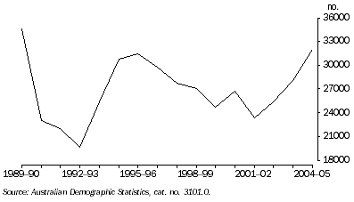 However, the gap between apprenticeship and traineeship commencements and completions has widened over the last three years, suggesting that more people are either failing to finish their training or postponing their training for a period of time. Either way, this has had a negative impact on the supply of these skills to the labour market. The discrepancy between the number of commencements and completions rose from 7,700 persons in 2001-02 to 10,200 persons in 2004-05.