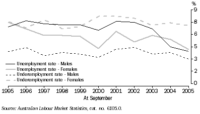 Western Australia's extended labour force underutilisation rate is currently at its lowest point in the past decade, having declined from 13.9% in September 1995 to 9.7% in September 2005. Despite a slightly larger improvement for females (4.5 percentage points) than for males (4.1 percentage points) over this period, the extended underutilisation rate in September 2005 remained significantly higher for women (12.4%) than men (7.6%).
