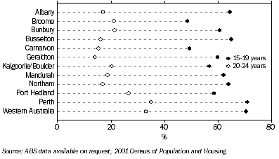 Education facilities such as universities and technical and further education facilities are important for youth wanting to study beyond compulsory schooling. Access to post-compulsory educational facilities, especially universities, is often limited outside Perth. This is reflected by the higher participation of youth attending universities or tertiary institutions in Perth (19%) than in the selected regional areas. Proportions ranged from less than 1% in Port Hedland to 6% in Bunbury and Kalgoorlie/Boulder. The higher proportions of youth attending a university or tertiary institution in Bunbury and Kalgoorlie/Boulder is likely to reflect the existence of the South West campus of Edith Cowan University in Bunbury and the Kalgoorlie Campus of Curtin University of Technology, specifically the WA School of Mines.