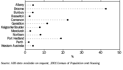 The proportion of young adults living in the parental home, particularly in the 20-24 years age group, can be attributable in part to the deferral of leaving home until completion of study, first marriage or achievement of financial independence (ABS 2000). Of 20-24 year olds, 41% in Perth were living in the parental home as a dependent student or non-dependent child. This was higher than youth of these ages in the selected regional areas where the proportion ranged between 14% in Port Hedland and 30% in Mandurah. The main reason for this difference was the significantly higher proportion of 20-24 year olds in Perth who were living at home as dependent students, 12% compared with less than 4% in the selected regional areas.