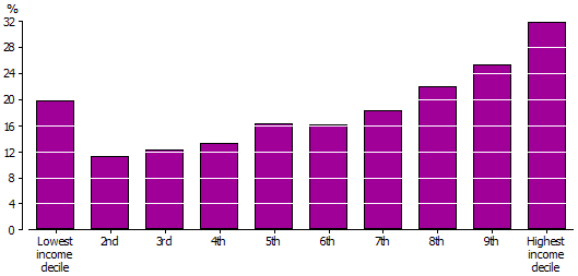* This proportion has a relative standard error between 25% and 50% and should only be used with caution. ** This proportion has a relative standard error exceeding 50% and is unsuitable for most purposes. Source: ABS 2007 Survey of Employment Arrangements, Retirement and Superannuation Workers living in high income households? After equivalising household incomes to standardise different household sizes and compositions, workers tended to be more likely to be overemployed the higher their household income. In 2007, only 12% of workers living in low income households (i.e. the 2nd or 3rd equivalised gross household income deciles) (Endnote 6) were overemployed. By comparison, 32% of workers living in households in the highest equivalised gross household income decile were overemployed. Both hours worked and overemployment rates were associated with household income. For example, the average number of hours worked weekly by employed people living in low income households was 28, and 12% were overemployed. Employed people with household income in the highest decile averaged 43 hours of work per week, and 32% were overemployed. PROPORTION OF EMPLOYED PEOPLE(a) WHO WERE OVEREMPLOYED BY EQUIVALISED GROSS HOUSEHOLD INCOME DECILE(b) - 2007 (a) Excludes contributing family workers and those whose preferred hours are not known. (b) Due to a number of reasons (including the possession of assets or underreporting) people in the lowest income decile may not necessarily be experiencing economic hardship. (Endnote 6) Source: ABS 2007 Survey of Employment Arrangements, Retirement and Superannuation Multiple job holders? In 2007, only 6% of employed people had more than one job. Overemployed workers were no more likely to be multiple job holders (7%) than other workers (6%). Employees or owner managers? In 2007, only 7% of casual employees were overemployed, largely reflecting the high rate of part-time employment amongst casual workers (69%). Other employees and owner managers of unincorporated enterprises (OMUEs) were more likely to be overemployed (23% and 24% respectively), while owner managers of incorporated enterprises (OMIEs) were even more likely to want to work fewer hours (37%). The relatively high overemployment rate among OMIEs partly reflects their comparatively long working week (44 hours on average). Employees with paid leave entitlements and OMUEs both averaged 40 hours of work per week, while casual employees worked a 24 hour week on average. Doctors, farmers and politicians? Some occupations are anecdotally highlighted by the media as entailing long working hours that can induce fatigue, burnout or accidents. In 2007, the major occupation groups most likely to experience overemployment were Managers (38%) and Professionals (26%). Not all organisations offer supervisory or managerial jobs to part-time workers, (Endnote 7) and senior management positions are less commonly available on a part-time basis in many organisations. Furthermore, keen competition for stimulating, well-remunerated jobs with prestige and autonomy may underpin long working hours to some extent in deregulated labour markets such as Australia. All other factors being equal, candidates for such jobs who work longer hours are more likely to achieve more and be selected for these jobs. In such cases, long working hours may represent an investment that enhances prospects for career progression. (Endnote 8) (Endnote 9) (Endnote 10) Among managers, those who were Education, Health or Welfare Services Managers were particularly likely to have been overemployed (52%). The overemployment rate was 39% among Chief Executives, General Managers and Legislators, and 34% among Farmers and Farm Managers. Of professionals, those who were Medical Practitioners (45%), School Teachers (38%) or Legal Professionals (32%) were among the most likely to have been overemployed in 2007. The high overemployment rate among medical practitioners may be partly due to demand for health care services exceeding the supply of doctors. (Endnote 11) Labour shortages could be a key factor behind relatively high rates of overemployment in some occupations, although cultural factors such as a well-established tradition of long working hours may also contribute to overemployment in others. (Endnote 8) (Endnote 9) (Endnote 10) SELECTED CHARACTERISTICS OF EMPLOYED PEOPLE(a) BY OCCUPATION IN MAIN JOB - 2007