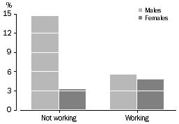 (b) All people in opposite-sex de facto couples (c) Includes a small number of people who did not say whether they expected to marry their partner. Source: 2006-07 Family Characteristics and Transitions Survey CHILD BEARING As higher rates of de facto relationships emerge, so too a greater proportion of people are having children outside of marriage. In the five years to 2007, close to one-third (32%) of all births have been to unmarried mothers, twice the average rate of the 1980s (16%). Around 78% of children aged 0-4 years in 2006-07 were the natural children of parents who were either currently married or who were previously married. This was ten percentage points more than the 68% born to married parents in 2002-07, suggesting that some parents got married after the birth of their child(ren). This is also supported by the fact that throughout the 2000s, births of a first child were twice as likely to be to unmarried parents (39%) as births of second or subsequent children (20%). In 2006-07, married people aged 25-44 years were twice as likely to have children as people of the same age in de facto relationships (77% and 37% respectively). Some of this difference is due to the fact that people in de facto relationships are more likely to have been in their relationship for a shorter period of time, and therefore have had less time in which to have children. However even after adjusting for this, people in de facto relationships were still much less likely to have dependent children (including those not living with them) than those who were married. BIRTHS REGISTERED TO UNMARRIED MOTHERS(a) (a) Include births to mothers aged under 18 years Source: Births, Australia (ABS cat. no. 3301.0) Intending to have children? Most younger people in childless couple relationships intend to have children, and this intention is not affected by the form of relationship they are in. In 2006-07, 86% of married people aged 18-24 years and 88% of those in a de facto relationship who did not already have children expected to do so. Childless couples aged 25-34 years were less likely to intend to have children (75%) if they were in a de facto relationship than married (85%). Some of the difference may be due to couples who intend to have children using this decision as a reason to get married. Among childless couples aged 35-44 years, the intention to have children was not significantly different between those in registered marriages (32%) and those in de facto relationships (41%). Childlessness While only 7% of women aged 35-44 years were childless and had never been in a live-in relationship, they accounted for 29% of all childless women of this age. Of those women who had had at least one live-in relationship, some 17% were childless, which was consistent with the expectation of childlessness among the 18-24 year olds in de facto relationships and marriages. WHO DOESN'T PARTNER While the vast majority (95%) of people aged 35-64 years have been in at least one live-in relationship, the proportion of those who have not had a relationship varies by particular characteristics. Men with a lower level of education were more likely to have never partnered (10.4% of men with no non-school qualifications compared with 5.0% for those with non-school qualifications). Women, on the other hand, were more likely to never have had a relationship if they had non-school qualifications (5.1%, compared with 3.3% for those women who did not have any non-school qualifications). As work and education are related, it is not surprising that different patterns of labour force participation can be seen for those who have and haven't partnered. Men who were not working in 2006-07 were almost three times as likely to have never had a live-in relationship (14.7%) as those who were employed (5.5%). For women, not working is strongly associated with child-rearing so this pattern did not hold - 3.2% of women who weren't working had never been in a live-in relationship, compared with 4.8% for those who were employed. NEVER PARTNERED PEOPLE AGED 35-64 YEARS, NON-SCHOOL QUALIFICATION - 2006-07 Source: 2006-07 Family Characteristics and Transitions Survey NEVER PARTNERED PEOPLE AGED 35-64 YEARS, WHETHER WORKING - 2006-07 Source: 2006-07 Family Characteristics and Transitions Survey CONCLUSION Changes in social attitudes in recent decades have led to greater acceptance of couple relationships outside of registered marriage, such as de facto and same-sex relationships. At the same time, broader social, economic and educational opportunities have become more accessible to most people (particularly women), which has made remaining single a more viable option. For some people, couple relationships outside of marriage may provide an opportunity to test the suitability of the match before making the commitment of marriage, whereas others may see no need to formalise what is for them a long-term and committed relationship. OTHER INFORMATION Data sources and definitions This article uses data from the ABS Census of Population and Housing, the ABS Family Transitions and Characteristics Survey and the ABS Marriages Collection. In this article, 'couple relationship' includes only people who usually live with their partner in the same dwelling, including those in registered marriages and de facto relationships. 'De facto relationship' refers to people living together as a couple who are not registered as married to each other. A de facto relationship may exist between a couple of the opposite sex or of the same-sex. 'Registered marriage' refers to people in a couple relationship who usually live together and have had their marriage formally registered. In this article, 'marriage' is used to refer to a registered marriage only. Unless otherwise stated, the information in this article relates to people aged 18 years and over. Measuring relationship status While the five-yearly Census can provide a snapshot of the relationship status of the population at 