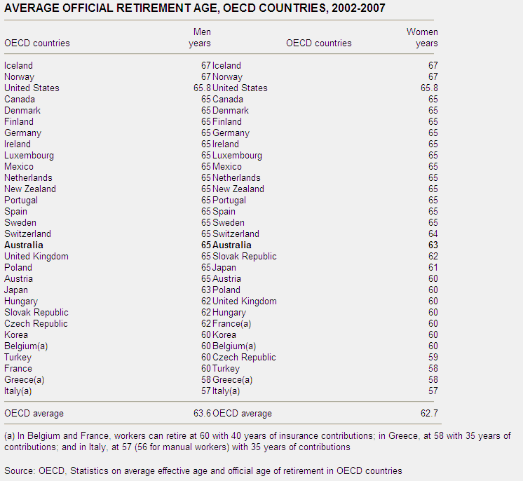 - While the official retirement age for Australian men in 2002-07 was higher than the OECD average, Australia's life expectancy is also higher than most other OECD countries - the exceptions are Japan, Iceland and Switzerland.