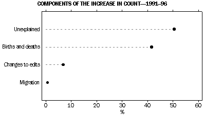 Combining the effects of births, deaths, census editing and migration, just under half of the increase in the count between 1991 and 1996 can be explained. There are variations by states and territories in the proportion explained; these are discussed in detail in the paper.