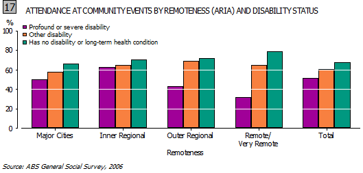 Attendance at community events in the last 12 months was higher for people without a disability living in inner regional to remote areas than those living in major cities. There was a similar trend amongst those people with less restrictive disability with a slight decrease in remote or very remote areas. For people with profound or severe disability, there was an increase from major cities to inner regional areas, but participation rates dropped for this group, the more remote the area in which the respondent lived (see Graph 17).