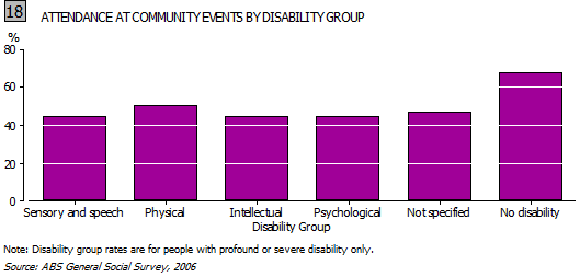People with intellectual disabilities were the least likely to have attended a community event in the previous 12 months. Type of disability made no statistically significant impact on attendance for the people with profound or severe disability attending a community event in the previous 12 months (see Graph 18).