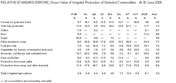 46 The estimates for gross value of irrigated agricultural production are based on information obtained from respondents to the ABS Agricultural Censuses and Surveys. These estimates are therefore subject to sampling variability (even in the case of the censuses, because the response rate is less than 100%); that is, they may differ from the figures that would have been produced if all agricultural businesses had been included in the Agricultural Survey or responded in the Agricultural Census.