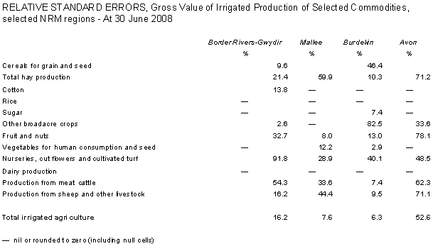 38 The gross value of irrigated agricultural production for the MDB is only presented for 2000-01, 2005-06, 2006-07 and 2007-08. The 2000-01 and 2005-06 data are available because they are sourced from the Agricultural Census which supports finer regional estimates, while the 2006-07 and 2007-08 data are able to be produced because of the improved register of agricultural businesses (described in paragraph 9). The ABS is still working on a methodology to produce estimates for the MDB for 2001-02 to 2004-05, and is hoping that in the next issue a full annual time series from 2000-01 will be available.