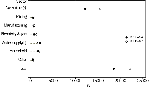 - The agriculture sector was the largest consumer of water, totalling an estimated 15,503 GL which represented 70% of total water consumption during 1996-97.