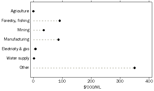 The agriculture sector is the most intensive user of water with an industry gross product (IGP) of $588/ML of water use in 1996-97 (includes IGP for both dryland and irrigated agriculture). This contrasts with the less intensive service industries sector (excluding utilities) which had an IGP per ML water use totalling $382,000/ML. All other sectors fall between these two extremes, with the utilities sectors (water supply, sewerage and drainage; and the electricity and gas industries) being the next most water intensive (graph 5).
