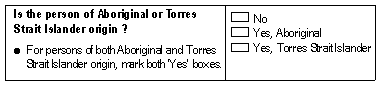 1 The term Indigenous is used in this publication to refer to Australian Aboriginal and Torres Strait Islander peoples. All Australian Bureau of Statistics (ABS) Indigenous population statistics are based on responses to the ABS standard question for Indigenous identification, which is used in self-enumerated collections. The same Census question has been used to determine Indigenous status (but not its component peoples) since the 1981 Census. The standard question format for Indigenous identification in the Census, that is shown below, was first used in this exact format in the 1996 Census, and was repeated in the 2001 Census.