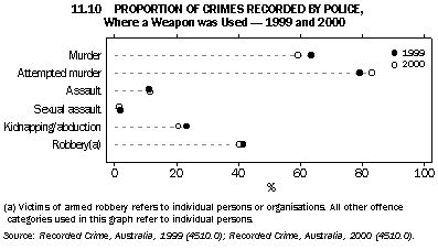 The majority of murders and attempted murders involved the use of a weapon (in 59% and 83% of offences, respectively, in 2000) (table 11.9 and graph 11.10). These crimes are much more likely to involve weapon use than other crimes against the person - robbery (weapon used in 41% of offences in 2000), kidnapping (in 21%) and assault (in 12%). There were some fluctuations between 1999 and 2000, but the proportions were broadly similar.