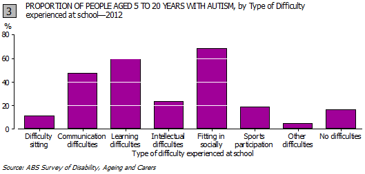 For children with autism who were attending school, 86% reported ‘having difficulty’ at school, the majority of whom had difficulty with fitting in socially, learning and communication (Graph 3).