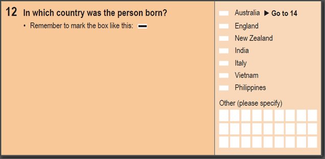 Respondents may either use a mark box to indicate the country of birth or write the name of any other country in the text field. The majority of responses for Country of Birth of Person were captured automatically from the mark box response (84.4%). Written responses were coded using a combination of automatic reading and coding processes (15.2%). The remaining responses required manual coding processes when they could not be coded or derived automatically (0.4%).