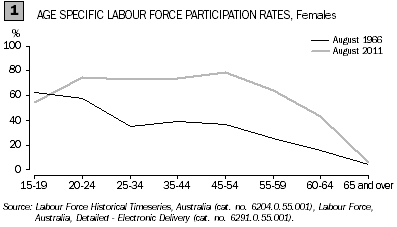 Having young children has a large influence on women's labour force participation. Nowadays many women reduce their working hours while their children are young, rather than leave the labour force altogether as was previously more often the case. In August 2011, the proportion of women working part-time in the 25 to 34 year age group (24%), although lower than women in the younger or older age groups, was still 2 times higher than it was in August 1966 (11%).