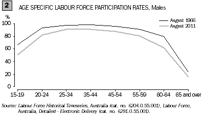 In August 1966, labour force participation for women reduced dramatically during the prime child raising years (20-24 and 25-34 year age groups), with the majority of women never to return to the labour force. In contrast, although a relatively slight 'nappy valley' effect can be seen between the ages 20-54, labour force participation in August 2011 is still a lot higher than it was and remains relatively unaffected by age from 20-54.