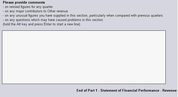 General Construction and Layout There should be an additional "E" at the end of all form IDs on the front of form to clearly indicate, in the Forms Repository view, that it is the Excel version of the paper form. If an "E" is already used in the form name, then use an "X" at the end. Layout of Excel form content is based directly on the paper form. This includes all instructions and notes except any paper-specific ones. For example, "Tick all that apply" should be replaced with "Please indicate with an 'X'..." and references to reply paid envelopes should be removed. The text of notes, definitions and instructions should align under the first letter of text, not under the dotpoint. However, this preferred formatting should only be done where practical, and where time permits. The bottom edge of response boxes should align with the text, or with the last line of text for questions with more than one line of text. In order to achieve this, you may have to use merged cells for the question text. For example: Diagram 3.1 It is possible to merge a number of cells across rows and columns in order have enough space to fit the question without the need to increase row heights. Using tall row heights for questions makes it impossible to align response boxes with the question text, so this practice should be avoided where possible. Response boxes should be correctly aligned because it makes it easier for the respondent to identify the correct place of response. Diagram 3.2 shows an example of the use of merged cells with and without formatting. The merged cells are identified by the lack of grid lines: Diagram 3.2 Forms are designed at a screen resolution of 800x600 to accommodate the lowest resolution in widespread use, and, allowing for the white space at the bottom of worksheets, so that they print off to closely resemble their paper equivalents. BSCs have the option to include comments boxes at the end of each part (worksheet) to enable the respondent to document any problems or concerns at the time they occur. This is currently a feature of the Local Government Finance (LGF) Excel form. For example: Diagram 3.3 If comment boxes are used, then the BSC's business process and IT systems may be affected, and the BSC should be made aware of this so that they can plan to identify and deal with the extra information being collected. Macros There are two types of Macros used for Excel forms, the first are form formatting macros used by the form developers to construct the form, protect it etc. These should not be stored in the form. The second type of Macro is meant for use by the respondent, and is stored within the form workbook. Note that Excel forms should not include macros unless there is a specific need that can only be achieved by using a macro. Such a macro is "Add Rows" in the IFAB Form 90 Excel workbook. These macros are developed by TA for ESG. Such macros should undergo extensive testing with providers and ABS processes (Secure Deposit Box). Note: care is required as some macros will not pass through our security systems and/or the provider's security. Macros for use by the respondent and represented by a button in the worksheet should be positioned intuitively. For example "Add Row" should be positioned at the end of the last row and column, where the respondent would already be looking when the need for additional rows arises. Buttons should not appear at the top of columns where they can be confused with column headings. Diagram 3.4 shows an example of where a button should be placed in relation to the relevant response box: Diagram 3.4 Worksheets and Sections All Excel forms are divided into worksheets of varying length that represent the sections or parts of the paper form. The main use and features of the worksheets will be described below. Excel forms may use more parts and sections than the paper form equivalents to aid navigation and for convenience in assembling the form. It can be easier to have standard parts (Please read first, How to use this form, How to submit, Time taken) separate, so that they can be inserted as a sheet into new forms. All forms should start with a standard 'How to use this form' worksheet about navigation and saving, followed by the 'Front of Form' and 'Please read this first' worksheets. For long forms, a 'Content' worksheet should be included after the 'Please read this first' sheet. This describes where to find the relevant sections, for example: Diagram 3.5 Each Part or Section has an Excel 'tab' at the bottom of the screen that can be used to navigate between worksheets. Tabs should be labelled with the part headings, not the part numbers (or letters). The exception to this rule is for a survey with a large number of worksheets, such as the Survey of International Investment (SII), where it is not practical to use the full part heading for every worksheet tab. The following example shows how the tabs should be labelled: Diagram 3.6 This example shows how tabs are labelled when there are a large number of worksheets: Diagram 3.7 If there are simply too many sheets to avoid some of them scrolling out of view horizontally, an additional instruction should be included in the 'How to use ..' section: Diagram 3.8 Inside a given section/part/worksheet the content is displayed in one scrolling 'page', though in some cases this results in only a portion of the screen being used. Subsequently, references to paper form page numbers are removed and inter-page gaps and spacing adjusted to give an even, continuous, display. Each worksheet ends with a note to the effect that it is the end of that worksheet. 'End of part' notifications should be placed in the bottom right hand corner of the 'page'. The natural navigation of the eye will make this area of the worksheet the last part viewed by the respondent. By putting the 'End of part' notification there, respondent eye movement is reduced. The 'End of part' notifications should also be meaningful by describing w