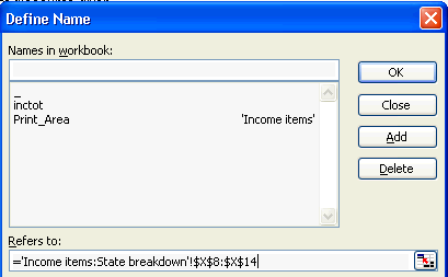 Diagram 3.12 A numeric format still allows text entry, but will left justify instead of right. Therefore, respondents are still able to enter a 'nil' response if they wish. Diagram 3.13.1 Diagram 3.13.2 Back to top Dimensions, Margins and Borders ABS Excel forms are designed to print out to the width of an A4 form, but absolute dimensions lose most of their meaning when using different screen and window sizes, fonts and resolutions. Excel measures cell width in terms of standard font characters, as specified in Microsoft Excel Help (2003): "The number that appears in the Standard column width box is the average number of digits 0-9 of the standard font (standard font is: The default text font for worksheets. The standard font determines the default font for the Normal cell style (Microsoft Excel Help, 2003)." The ABS Excel templates use a 'standard font' of Arial 10 point. Column widths must vary from sheet to sheet to allow for a variety of layouts. There are a number of different column settings for different page layouts, these are partly automated through the formatting macros, and can be adjusted for the needs of the form. The width of margins are relevant to printing only. Minimum margin requirements vary from printer to printer and can be altered in: <File>, <Page Setup> then <Margins>. The top and bottom margins are set to at least 1cm. Cell borders are set to the finest solid black line for data entry cells, and the second finest for white borders. Diagram 3.14 Radio Buttons and drop down menus The use of radio buttons and drop down boxes in Excel forms is under consideration. Radio buttons may be used for mutually exclusive yes/no or choose one only questions. One advantage of using a radio button is that the round shape of the response spaces help to differentiate mutually exclusive type questions from 'tick all that apply' type questions. Drop down boxes do not work as well and should only be used sparingly for lists of response items. Long lists in drop down menus are problematic due to the need for scrolling, when using drop down menus the entire list should be visible when activated, i.e. without the need for scrolling. Drop down menus share the same risk of ordering effects as printed lists, for example, respondents tend to answer in the top third of the list. If there is some natural order to the items in the list, this order should be used, otherwise the list should ordered alphabetically. These tools should not be used unless thoroughly tested with providers. Tagging/naming data items In the future eforms will be required to have a 'named range' defined for each single entry field or column of entry fields. The 'named range' is given a unique label so that any individual entry field can be retrieved. The names used for the 'named range' will be important in reducing the amount of concordance work done between exporting data from the eform and the eventual load process to the Input Data Warehouse (IDW). The Blaise system name should be matched to each data cell. The Collection Management Unit should be consulted when tagging an Excel form. To name a cell(s) select and highlight the relevant cell(s). Go up into the name box located on the left side of the screen under the toolbar. As shown in Diagram 3.15, type a name for the cell(s) then press enter to save the name. For example: Diagram 3.15 Alternatively you can open the 'Name' dialogue box by choosing <Insert>, <Name> then <Define> from the main menu as is shown in Diagram 3.16. Type a name in the "Names in workbook:" box, then go to "Refers to:" box, delete the reference that appears, if any, then using the mouse highlight the relevant cells. For example: Diagram 3.16 Additional to cell tagging, each data sheet should be tagged with an embedded ID and both data sheets and the Front of Form sheet should have an ETL-PIMS metadata ID.