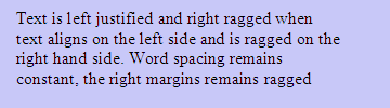 Text is left aligned (justified) right ragged when only the left margin follows a straight line. Word spacing remains constant, the right margin remains ragged, and the line finishes at the word break closest to the maximum line width, as in Diagram 5.2.