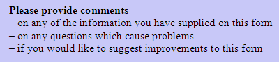 It is required that comments from the respondent are requested at the end of ABS business forms, as the second last question. It is recommended that the question shown in Diagram 5.29 be used, or see the section on Optical Character Recognition(OCR forms). This question should be set in 12 point bold and followed by as much space is considered adequate. This allows respondents to provide information on the three different aspects. This wording may be tailored depending on collection specific needs, in addition to general comments on the form. The question may be used to ask specifically about data, such as changes since last quarter, but it is preferred that such issues are asked about separately where space allows.