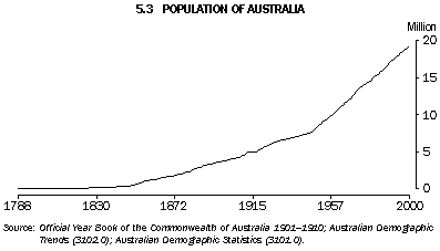 As shown in table 5.1, Australia's estimated resident population at June 2000 was just over 19 million, an increase of 1.2% over the previous year. The slightly higher growth rate in 1999-2000 was due to a 16% increase in net overseas migration over the previous year (from 85,100 to 99,100 persons).