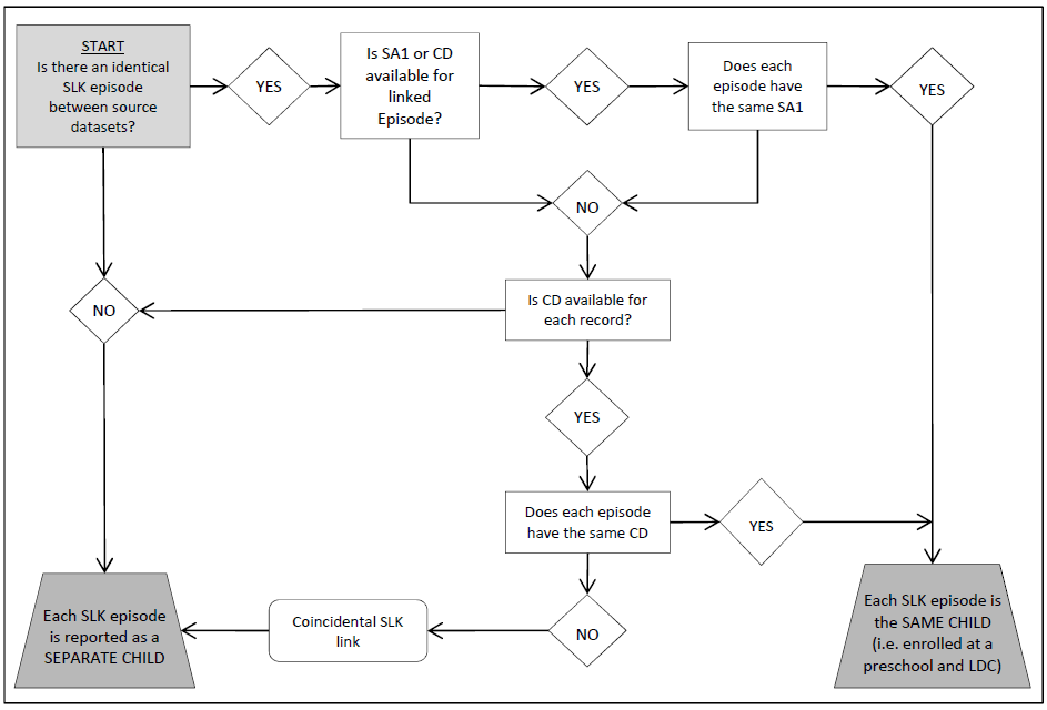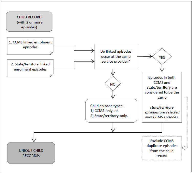 LINKING BETWEEN-FILES Figure 3.10: ‘Between file’ episode linking methodology Between-file episode linking was completed for each individual state and territory and conducted between a state and territory file and the CCMS. Duplicate episode records for a unique child at a service provider: A child who is enrolled within a service provider can be reported within both a state and territory collection and the CCMS. In some scenarios, each data source may be reporting about different preschool experiences within the same service provider. The different data sources could also be reporting the same preschool experience. Due to the nature of state and territory collections and the CCMS, there is no way to definitively know what these linked episode records at a service provider represent. Operationally, for the 2012 National ECEC Collection, linked episode records at a service provider were considered duplicates. To determine if two or more episodes linked to a child were unique or duplicates of each other, the following business rules were applied. This process applied for each state and territory after both the ‘Within File’ and ‘Between File’ linking processes had been completed. Duplicate episode record checking within a service provider: The ABS as part of the Preschool Provider Frame (PPF) (for more information on the PPF refer to Chapter 1: Collection Scope and Coverage) allocates a unique identifier to each unique service. The ABS provider ID is used to identify service providers within and across data files, and across collection years. Figure 3.11 below, outlines how a child record with two or more episodes that share the same ABS provider ID code were considered as being a duplicate of each other. In this scenario, the state/territory supplied episode is selected over the CCMS source episode and the duplicate episode is removed from the child record. If a child enrolled in one service provider has multiple episodes originating from the same state and territory file, these episode duplicates are not removed from the child record. For a child record with corresponding episodes that have different ABS provider ID codes, each episode is considered to be unique and remain a component of the child record. Figure 3.11: Child-episode reporting business rules for two or more episodes(a) (a) This process will occur for each state/territory after the ‘Within file’ and ‘Between file’ linking process has been completed.