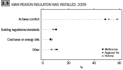The proportion of insulated dwellings in Australia has increased from 52% in 1994 rising to 61% by 2008 (ABS 2008). In 2005, 84% of households installing insulation in Australia gave the main reason for installing to improve comfort, while 34% of people without insulation stated the main obstacle to installing insulation was that they were not responsible for the insulation. Saving energy ranked low on the list of reasons for installing insulation (ABS 2005).