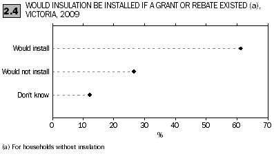 While 67% of separate houses in Victoria would install insulation if a rebate or grant existed, only 48% of semi-detached dwellings, apartments units or flats would install insulation. 75% of households with a household income of $110,000 per year or above would install insulation if a grant or rebate existed while 50% of households with an income of less than $25,000 per year would install insulation if a rebate or grant existed.