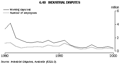 The number of working days lost per year, and the number of employees involved, have fluctuated from year to year, but have demonstrated a significant downward trend over the last two decades (graph 6.48). The number of working days lost in 2000 was 469,100, a decrease of over 28% on the 1999 outcome. Over the same period the total number of employees involved in industrial disputes (either directly or indirectly) decreased by almost 30% (table 6.49).