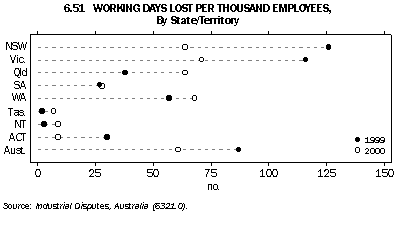 There were 61 working days lost per thousand employees in 2000, compared to 87 working days lost per thousand employees in 1999 (graph 6.51). This fall was due to large falls in NSW (down 62 working days lost per thousand employees) and Victoria (down 45). Victoria (71 working days lost per thousand employees), Western Australia (68), NSW (64) and Queensland (64) recorded the highest number of working days lost per thousand employees in 2000, while Tasmania (7), the Northern Territory (9) and the ACT (9) recorded the lowest number of working days lost per thousand employees.