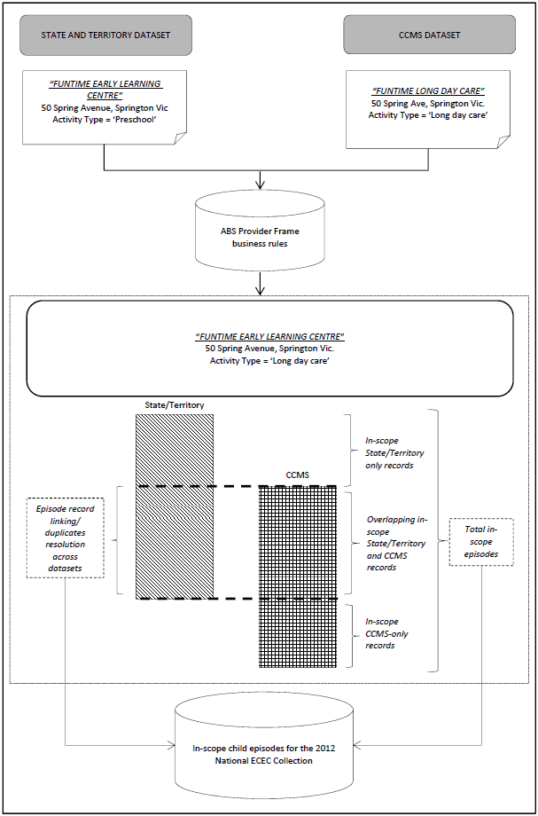 SECTOR CLASSIFICATION FOR THE NATIONAL EARLY CHILDHOOD EDUCATION AND CARE COLLECTION Figure 4.1 Sector Classifications Management type is not disaggregated within the long day care (LDC) classification due to data availability issues associated with the Child Care Management System (CCMS). A data quality statement for the CCMS can be found in Chapter 6: Jurisdictional Data Quality Statements – Australian Government. The child classification category ‘Long day care with a preschool program and Preschool’ within the sector classification is derived by the ABS. The example outlined in figure 4.2 shows how a child may be enrolled in both ‘preschool’ and ‘long day care’. In this scenario, unique child records would be presented under the sector classification ‘Long day care with a preschool program and Preschool’. Figure 4.2: Derived ‘Sector Classification’ from two episodes Derived Sector Classification In 2011, as part of the National Early Childhood Education and Care, Preschool Provider Frame project, the ABS created a comprehensive frame of all service providers with a preschool service. A summary of the 2011 ECEC provider frame was presented at Table A2 of the Experimental Estimates of Preschool Education, Australia, 2011 (cat. no 4240.0). In 2012, the ABS continued developing the ECEC provider frame through utilising existing infrastructure that supports the broader National Early Childhood Education and Care Collection. This infrastructure facilitates the merging of multiple sources of service provider information to identify unique service providers delivering ECEC services in Australia. The example presented in Figure 4.3 shows how the same service provider may be reported by a state and territory collection as well as the CCMS. A state or territory may report a state/territory funded ‘preschool’ at a particular location. At the same centre, a long day care program may also operate with enrolled children receiving a preschool program within both preschool and child care components (by definition of the National Early Childhood Education and Care Collection). In this example, a child may be reported by both a state or territory and the CCMS. While the management types for the two programs may be different (i.e. a government preschool and a community LDC), the two programs operate from the same service provider. In these scenarios, the ABS has reclassified the service provider activity type as ‘LDC with preschool’ to best reflect the nature of activities delivered by these service providers, within the current framework of the National ECEC Collection Standards. Methodological Implications on the New Derived Service Provider Classification Service Providers The change in methodology to the 2012 National ECEC Collection will result in the movement of service provider records across service activity type categories. This has a potentially significant impact on service activity output with an increase in ‘long day care delivering a preschool’ and a decrease in preschools. This change in collection methodology will have no impact to states and territories where there is no service provider overlap in 2012 with CCMS and their collections. Child Episode Records The 2012 National ECEC Collection utilised as many available episode records attached to a service provider as possible, irrespective of data source. Figure 4.4 below shows how child episodes are utilised in the new collection methodology to increase the accuracy of the number of episodes for inclusion. Figure 4.3: Child Episode reconciliation from multiple data sources for a single service provider In-scope episodes used in output populations include a combination of state and territory-only, CCMS-only and overlapping state and territory and CCMS records. Of the overlapping episode records, only one episode (always from a state and territory collection) is chosen is chosen if they are for the same child at the same service provider. Figure 4.4: Service provider determination from ABS Provider Frame and associated child episodes Based on this methodology, episode and child level data presented can be sourced from state and territory-only episodes and/or CCMS-only episodes as well as the overlapping episodes. Child Episode to unique Child Record and Year Before Fulltime Schooling Within collection output tables, users can expect movements between children enrolled / attending ‘preschool’ and ‘long day care’ categories as well as movements between children enrolled / attending ‘long day care with a preschool’ and ‘long day care with a preschool and Preschool’. Child Episode reconciliation from multiple data sources Figure 4.4 depicts how the change in 2012 collection methodology impacts on child episodes. In this example, the state and territory-sourced “Funtime Early Learning Centre” and CCMS-sourced “Funtime Long Day Care Centre” at the same location have been linked within the National ECEC Collection processes. The derived sector classification methodology has been applied and the service provider has been classified as a ‘Long Day Care’ centre. All child episodes attached to each collection source (CCMS or state and territory) for a linked service provider (eg “Funtime Early Learning Centre” and “Funtime Long Day Care”) now share the same service provider characteristics (management type and service activity type). For all child episodes within a service provider having linked episodes in both a state or territory and CCMS files, only state and territory sourced episodes will be utilised. All episodes within a service provider are utilised for child episodes sourced only from a state and territory file or CCMS. All child episodes from either input file are now classified as Long Day Care and will be counted as episodes of Long Day Care in ABS publication tables. Sector Classification Reporting As a result of data processing methods for the National ECEC Collecti