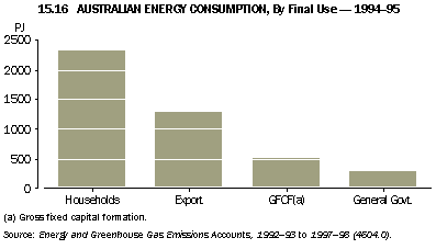Household electricity use was the other major contributor to energy consumption attributed to households. The 1970s and 1980s saw significant increase in the level of indoor comfort and amenities in Australian homes for space comfort, water heating and electric appliances. Natural gas and electricity are the key sources of space heating (table 15.19). In 1999 natural gas was the main heating source for 41% of residences that had space heating (up from 38% in 1994); electricity provided 35% and wood most of the remainder. Over the period, electricity lost share to gas. As comfort standards have increased, whole house heating rather than 'spot' heating increased and pipeline gas became more widely available (OECD/IEA 2001). Electricity is the major source of energy for both water (about 60% in 1999) and cooking (about 59%).