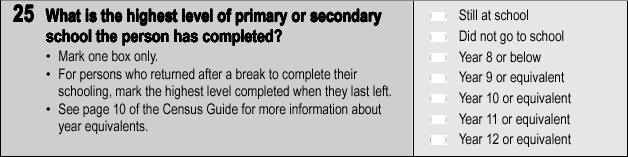 This variable records the highest level of primary or secondary school a person has completed. The data are used to help build a picture of the education levels in each area of Australia and to assist planning of educational facilities. More Detailed Description