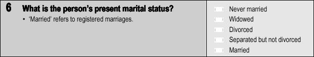 This variable records an individual's current status in regard to a registered marriage, i.e. whether he/she is widowed, divorced, separated, married or never married. More Detailed Description