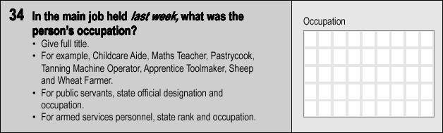 Occupation is collected in the Census for all employed people aged 15 years and over. Two questions are used in the Census. The first of these asks for occupation title (in main job held in the week prior to Census Night). The second asks for the main tasks usually performed by the person in their occupation. Collecting both occupation title and task information ensures more accurate coding of occupations. More Detailed Description