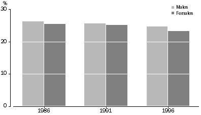 The proportions of young people aged 12-17 (92%) and 18-25 years (43%) attending educational institutions were above the national proportions of 87% and 30% respectively, and were higher than any other State or Territory. Given the legal age requirement for school attendance, education participation rates were highest for the younger age groups. Almost all (96%) of those in the 12-14 years age group reported that they were still at school, with the majority of these (60% or 8,039) attending government schools. Among 15-17 year-olds, educational participation remained high, with 84% at school and 5% in post-secondary education. Non-main English-speaking birthplace Participation in education was very high among young people born overseas in a non-main English-speaking country. Almost three-quarters (74%) of them were attending an educational institution. This was much higher than the general level of educational participation for young people (62%) and suggests the presence of an overseas student population. Almost 29% of young people born overseas in a non-main English-speaking country reported attending a university or tertiary institution, compared with 17% of all young people in the Australian Capital Territory. Indigenous people Among Indigenous young people aged 12-25 years, 49% (426) were attending an educational institution in 1996. Most of the participation was in the younger age groups, with 91% of 12-14 year-olds and 59% of 15-17 year-olds in education. Just 9% of all Indigenous young people in the Australian Capital Territory reported attending a university or other tertiary institution. Education and labour force status Many young people attending educational institutions were also employed. Among 15-25 year-olds who were attending a tertiary or other institution in 1996, 59% were employed either full-time (22%) or part-time (35%). Among young people attending a tertiary or other institution full-time, 38% (32% in 1991) were also working part-time. Qualifications In the five years from 1991 to 1996, the proportion of 15-25 year-olds with post-secondary qualifications increased from 16% to 21%. Among persons aged 26 years and over, the proportion increased from 44% to 48% over the same period. Young people in the Australian Capital Territory were also more highly qualified in 1996 than five years earlier. Among those young people holding post-school qualifications, the proportions who had attained a bachelor degree or higher increased from 40% to 44%. Among all 15-25 year-olds in 1996, a higher proportion of females than males held post-school qualifications (23% compared with 19%). The qualifications most commonly held by young females were bachelor degrees (10%), followed by basic vocational qualifications (4%). The most common qualifications among young males were bachelor degrees (8%), followed by skilled vocational qualifications (5%).