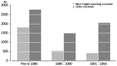 Among young people in the Australian Capital Territory who arrived in Australia prior to 1986, the highest proportion had been born in the United Kingdom (22%), followed by those born in New Zealand (7%). Among those who arrived between 1986 and 1990, the highest proportion were born in the United Kingdom (13%), New Zealand (7%), and Hong Kong and Viet Nam (6% each). Among those who arrived more recently (1991-96), only 17% were born in one of the main English-speaking countries. However, the highest proportion (8%) were born in New Zealand, followed by 6% each from Hong Kong and Viet Nam, and 5% from India.