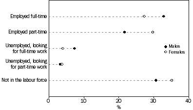 Main Findings Labour force status In the Australian Capital Territory at the time of the 1996 Census, there were 38,402 15-25 year-olds in the labour force; that is, they were either employed or looking for work. They made up 24% of the total labour force (161,219 people), down from 25% of the total labour force in 1991. The majority (86%) of these young people were employed. Participation rates The labour force participation rate for young people in 1996 was 67%. Participation among Indigenous young people was lower at 58%, and among young people born overseas in a non-main English-speaking country, the participation rate was 46%. This reflected the much higher level of educational participation by this group. Between 1991 and 1996 the male participation rate fell from 68% to 67%, whereas the female participation rate rose from 66% to 67%. Full-time work The proportion of young people employed in full-time work fell between 1991 and 1996 from 34% to 30%. This decrease was experienced by both young females and males and reflected the general move in the labour force from full-time to part-time work, especially for young people. Part-time work The proportions of both young and older people employed in part-time work have increased. Between 1991 and 1996, the proportion of young people in the Australian Capital Territory who were employed part-time increased from 21% to 26%, and for older people, from 16% to 17%. Among the 15-25 year-olds who were employed, 51% of young females, and 38% of young males, were employed part-time. Unemployment In 1996, the unemployment rate for young people in the Australian Capital Territory was 14%, that is, 14% of 15-25 year-olds in the labour force reported that they were looking for work. Among young males, the rate was 16%, compared with 12% for young females. Another measure of unemployment among young people, which takes account of the varying labour force participation between age groups, is the proportion of the total population in the age group who were unemployed. In the Australian Capital Territory in 1996, fewer than 7% of 15-17 year-olds were looking for work. Among other age groups, this proportion was almost 13% for those aged 18-19 years, 10% for 20-24 year-olds, and 7% for 25 year-olds. Among all 15-25 year-olds, 9% were unemployed. Industry In 1996, the leading industries of employment for both young males and females were Retail trade (26% and 27%); Government administration and defence (17% and 14%); and Accommodation, cafes and restaurants (10% and 11%).