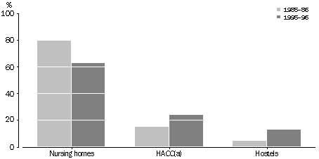 Reflecting the change in emphasis from intensive forms of residential care, such as nursing homes, to community care programs and hostel accommodation, hostels increased their share of total aged care expenditure between 1985-86 and 1995-96. Their share increased from 5% to 13% over this period, while nursing home expenditure declined as a proportion of the total (from 80% down to 63%). By 1997-98, the annual cost to government (excluding capital funding) was $29,648 for a utilised place in a nursing home and $9,360 for a hostel. The cost to an individual varied according to their income and assets.
