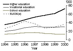 The increase in overseas student numbers in vocational education (from 19,500 in 1994 to 30,800 in 2000) could be attributed to the fact that the vocational education and training sector expanded during the 1990s. Overseas students may have been attracted to its increasingly varied curriculum.