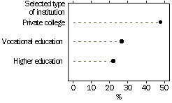 In addition to overseas students who come to Australia to study towards degrees, certificates and other long-term courses, some students come for shorter periods to undertake courses in English language. Around 36,800 or 24% of overseas students were undertaking English Language Intensive Courses for Overseas Students (ELICOS) in 2000. These courses can be undertaken at a variety of institutions. While those undertaken at higher education and vocational education institutions may be part of a degree or diploma, those undertaken at private institutions can be as short as six weeks. In 2000, almost half (48%) of overseas students undertaking ELICOS were studying in private colleges, while 27% were studying at vocational education institutions and 22% at higher education institutions.