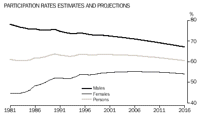 SUMMARY OF FINDINGS The labour force is projected to age quite dramatically, with over 80% of the projected labour force growth occurring in the 45 years and over age group. Females are projected to increase from 43% to 45% of the labour force. HOW LIKELY IS IT THAT THESE PROJECTIONS WILL EVENTUATE? The bulk of the labour force in 2016 will be made up of people who are currently alive and in Australia. The size and age distribution of the current Australian population is the most important factor in determining the size and age distribution of the labour force in 2016. Changes in participation rates, and the components of population growth (birth and death rate and overseas migration levels) will have a relatively small impact on the future labour force. THE FUTURE WON’T BE LIKE THE PAST Because of the ageing of the population, population growth will slow. Therefore, it will not be possible for labour force growth to continue at historic rates. Immigration and labour force participation rates may rise, which would moderate the fall in employment growth. However, any increase in these components is unlikely to be large enough to prevent a significant fall in employment growth from historical levels. Document Selection These documents will be presented in a new window.