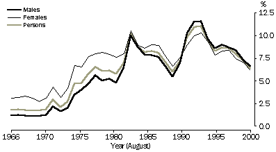 Source: ABS Labour Force Survey, 1966-1977; Labour Force, Australia, 1978-2000 (ABS cat. no. 6203.0 and 6204.0).