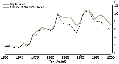 For much of the period between 1966 and 1984, unemployment rates in capital cities and the rest of the state were similar, with both experiencing fluctuations associated with economic cycles. However, people living outside the capital cities were more affected by the economic downturn in the early 1980s and mid-1990s. Unemployment rates outside capital city areas remained around 9% until 1987 following the economic downturn in 1983 and around 9% until 1998 following the economic downturn in 1993. In contrast, the rates in capital cities over the same time periods were generally around 7% and 8% respectively.