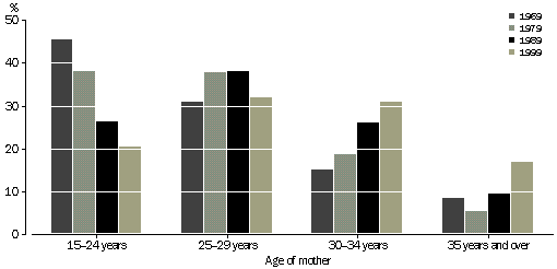 Changing age profile of mothers Since the peak in 1961, the total fertility rate of Australian women has been declining. Between 1969 and 1979, the total fertility rate dropped from 2.9 to 1.9 babies per woman. Much of this drop can be attributed to a rapid decline in the fertility rates of women in the 20-24 and 25-29 year age groups, although women of all age groups experienced some decline in fertility rates during this period. AGE-SPECIFIC FERTILITY RATES(a) (a) Births per 1,000 females. Source: Births, Australia, 1999 (cat. no. 3301.0). Between 1979 and 1999, the total fertility rate decreased slightly from 1.9 to 1.7 babies per woman. However, this period saw a noticeable change in the timing of births. The fertility rate of women aged under 30 years continued to decline while that of women aged 30-34 years increased by 47% (from 74 births per 1,000 women in 1979 to 109 per 1,000 in 1999). At the same time, the fertility rate of women aged 35-39 years doubled (from 24 to 47 births per 1,000 women), as did that for women in the 40-44 years age group (from 5 to 9 births per 1,000 women). Nevertheless, the gains made in the older age groups did not make up for the drop in fertility in the younger age groups. The changes in the proportion of births occurring to women of different age groups further illustrates the shift towards older motherhood. In 1979 nearly one in four births (24%) were to women aged 30 years and over. In 1999, nearly one in two births (47%) were to women aged 30 years and over. The biggest change has occurred in the 15-24 years age group, with the proportion of births declining from 46% of all births in 1969 to 20% in 1999. The proportion of births to women aged 25-29 years remained relatively steady. PROPORTION OF ALL BIRTHS BY AGE OF MOTHER Source: Births, Australia, 1969, 1979, 1989 and 1999 (cat. no. 3301.0). Timing of first children The falling fertility rates of women aged under 30 years and the rising fertility rates of women in their thirties and early forties, are consistent with women having their first and subsequent births later in life. Although the proportion of first births to all births remained relatively steady between 1993 and 1999, there was a change in the age distribution of mothers having their first birth. Women experiencing their first birth in 1999 tended to be older than women having a first birth in 1993. Approximately 28% of all first births in 1993 were to women aged 30 years and over. By 1999 this had increased to 34%. In contrast, 31% of all first births in 1999 were to women aged 15-24 years (down from 37% in 1993). Census data on the number of children ever born to a woman provide further evidence that women are tending to have their first child later in life. In 1986, 67% of women aged 20-24 years had not had a child. By 1996 this had increased to 76%. In 1986, 40% of women aged 25-29 years had not had a child. This increased to 53% in 1996.2 Not all of these women will give birth later in life as some will remain childless (26% based on 1999 rates).2 The later a woman has her first child, the later she will have other children. Between 1993 and 1999, the proportion of second births to women aged 30 years and over increased from 44% to 52%. FIRST AND SECOND BIRTHS