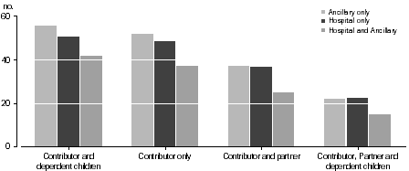 (b) $240-$599 gross per week. (c) $600 or more gross per week. (d) Includes income not known. Source: Health Insurance Survey Family composition Contributor units consisting of couples (with or without dependent children) had the highest levels of private health insurance coverage (over 50%), while those consisting of one contributor and dependent children had the lowest (23%). For all contributor unit types level of insurance coverage increases with income. The higher level of private health insurance coverage for contributor units containing couples reflects their generally higher incomes. Of such contributor units, 48% received high incomes, 42% received middle incomes and 4% received low incomes. Of contributor units consisting of a contributor (with or without dependent children), 15% received high incomes, 40% received middle incomes and 42% received low incomes. Couples with dependent children were more likely than other types of contributor units to have hospital and ancillary cover while couples without dependent children had the highest rate of hospital only cover. Ancillary only cover was more prevalent in contributor units with dependent children than in those without. PROPORTION OF CONTRIBUTOR UNITS WITH PRIVATE HEALTH INSURANCE, 1992