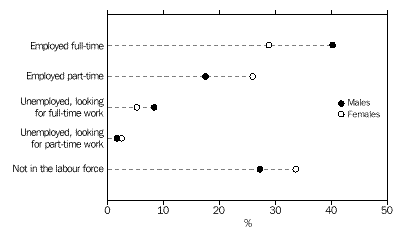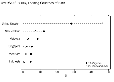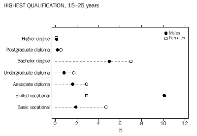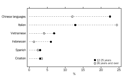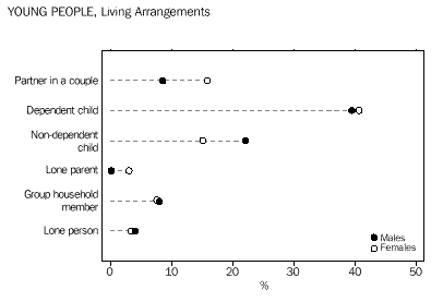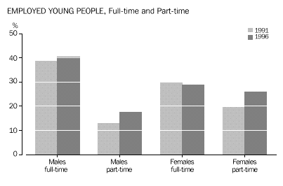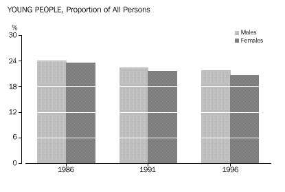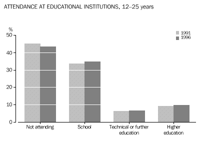 CHAPTER 3 CULTURAL DIVERSITY Indigenous people In the 1996 Census, 4% (14,199) of young people in Western Australia reported being of Indigenous origin. This proportion was above the national average of under 3%. In comparison, among those aged 26 years and over, Indigenous people comprised fewer than 2% of the total. Overseas-born Western Australia had the highest proportion of young people born overseas (19%) of all the States and Territories, well above that for Australia as a whole (14%). Almost twice the proportion (37%) of Western Australians aged 26 years and over had been born overseas.. Countries of birth Just under half (49%) of overseas-born people aged 12-25 years were born in the main English-speaking countries (Canada, Ireland, New Zealand, South Africa, the United Kingdom and United States of America). Almost 59% of older people born overseas were from these countries. Young people from the non-main English-speaking countries were more likely to have been born in Asia than a European country. The largest number were born in Malaysia (5,777) followed by Singapore (3,362) and Viet Nam (3,058). Among overseas-born aged 26 years and over, the proportions born in these countries were smaller. Among young people who arrived in Australia between 1986 and 1990, the highest proportions were from the United Kingdom (29%) and New Zealand (14%). For more recent arrivals (between 1991 and 1996), 14% were from the United Kingdom, 13% from Malaysia and 12% from New Zealand. Almost 39% (109,421) of Australian-born young people had at least one parent who had been born overseas, compared with 30% of those aged 26 years and over. For 7% of 12-25 year-olds born in Australia, both parents had been born in a non-main English-speaking country. Languages spoken at home Just under 12% (42,352) of young Western Australians spoke a language other than English at home. Of these young people, almost 23% spoke one of the Chinese languages, another 13% spoke Italian, and 7% spoke Vietnamese. Among older people, the most common language other than English spoken at home was Italian (24%). Proficiency in English The majority (86%) of young Western Australians spoke English only. Of those young people who spoke another language at home, 8% (3,485) reported speaking English not well or not at all. Among older people (aged 26 years and over) this proportion was much higher (19%). CHAPTER 4 LIVING ARRANGEMENTS Marital status The majority (73%) of young people aged 15-25 years in Western Australian were not married, 7% reported being in a registered marriage and 8% in a de facto marriage. Among older people, 60% reported being in a registered marriage, and 6% in a de facto marriage. Living arrangements Over 40% of 12-25 year-olds were living with their parents as dependent children. Another 22% of young males, and 15% of young females, were living as non-dependent children with their parents. Young women were more likely than young men to have moved from the family home, forming partnerships and their own families (19% compared with 9% of young males). Among young people born in non-main English-speaking countries, 15% of young women and 6% of young men had formed partnerships and families of their own. Another 39% were living as dependent children with their parents. A high proportion (12%) were living in group households, perhaps reflecting the high numbers of overseas students in this group. Among Indigenous young people, relatively high proportions (28% of females and 12% of males) had formed partnerships, or their own families. Almost one-third (32%) were dependent children living with their parents, and just over 16% were living as non-dependent children. Type of dwelling About 4% of 12-25 year-olds in Western Australia had spent census night in a non-private dwelling. Large numbers of these young people were in boarding schools or residential colleges (6,621), in staff quarters (2,976), or staying in hotels, motels or guest houses. Another 2,089 young people reported having no usual address. Type of tenure About 59% of young people occupied dwellings which were owned or being purchased, compared with over 70% of people aged 26 years and over. Almost one-third (32%) of young people were living in rented dwellings, compared with 20% of older people (aged 26 years and over). Over two-thirds (67%) of Indigenous young people, and 36% of those born overseas in non-main English-speaking countries, were in rented dwellings. CHAPTER 5 EDUCATION Attendance at educational institutions More than half (52% or 188,410) of all 12-25 year-olds were attending an educational institution in 1996. This compares with 50% in 1991. The participation rate for females (53%) was slightly higher than for males (51%). Between 1991 and 1996, there were slight increases in the proportions of young people attending schools (from 34% to 35%), technical or further educational institutions (from 6% to 7%), and in higher education institutions (9% to 10%). As could be expected, given the compulsory nature of school attendance, education attendance was highest among the younger age groups. In the 12-14 years age group, almost 94% (74,120) reported attending school, with the majority (69%) in government schools. Among 15-17 year-olds, educational attendance was lower, with 65% at school and 9% attending a technical or further education institution or a higher education institution. Education participation continued to decline with age, with 44% of 18-19 year-olds and just under one-quarter (24%) of 20-25 year-olds remaining in education. Non-main English-speaking birthplace Participation in education was very high among young people born overseas in a non-main English-speaking country. Almost three-quarters (72%) of them were attending an educational institution. Much of this participation was among older youth, with 79% of 18-19 year-olds and 57% of 20-25 year-olds remaining in education. Indigenous people Among Indigenous youth aged 12-