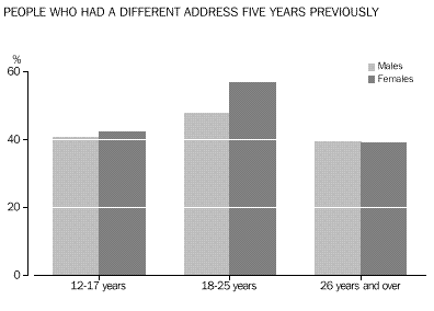 INTRODUCTION There were more males than females in the 12-25 years age group (185,980 compared with 176,894). Males slightly outnumbered females at all ages up to 25 years. In the older population (26 years and over) the number of females exceeded the number of males by 16,551. Among all people counted in Western Australia, the proportions of males and females were almost identical. Geographic distribution In 1996, there were 270,754 young people in the Perth Statistical Division, representing 75% of all 12-25 year-olds in Western Australia. The next highest number of young people were counted in the South West Statistical Division (30,038). The highest concentration of young people was in South Eastern Statistical Division (23%), followed by Perth (22%). Movement Young people reported being more mobile than older people. Almost 48% of 12-25 year-olds reported living at a different address than five years previously, compared with 39% of older people. A similar pattern was evident for residential movement within the previous twelve months, with 26% of young people and 14% of older people being at a different address. Most of this movement had taken place within Western Australia. For both 12-25 year-olds and older people, about 89% of those who had moved in the previous five years had moved within the State. Young females were more likely to have moved than young males. Almost 51% of young women reported living at a different address from five years ago, compared with 45% of young men. For the older population, approximately 39% of both males and females were living at a different address from five years ago.